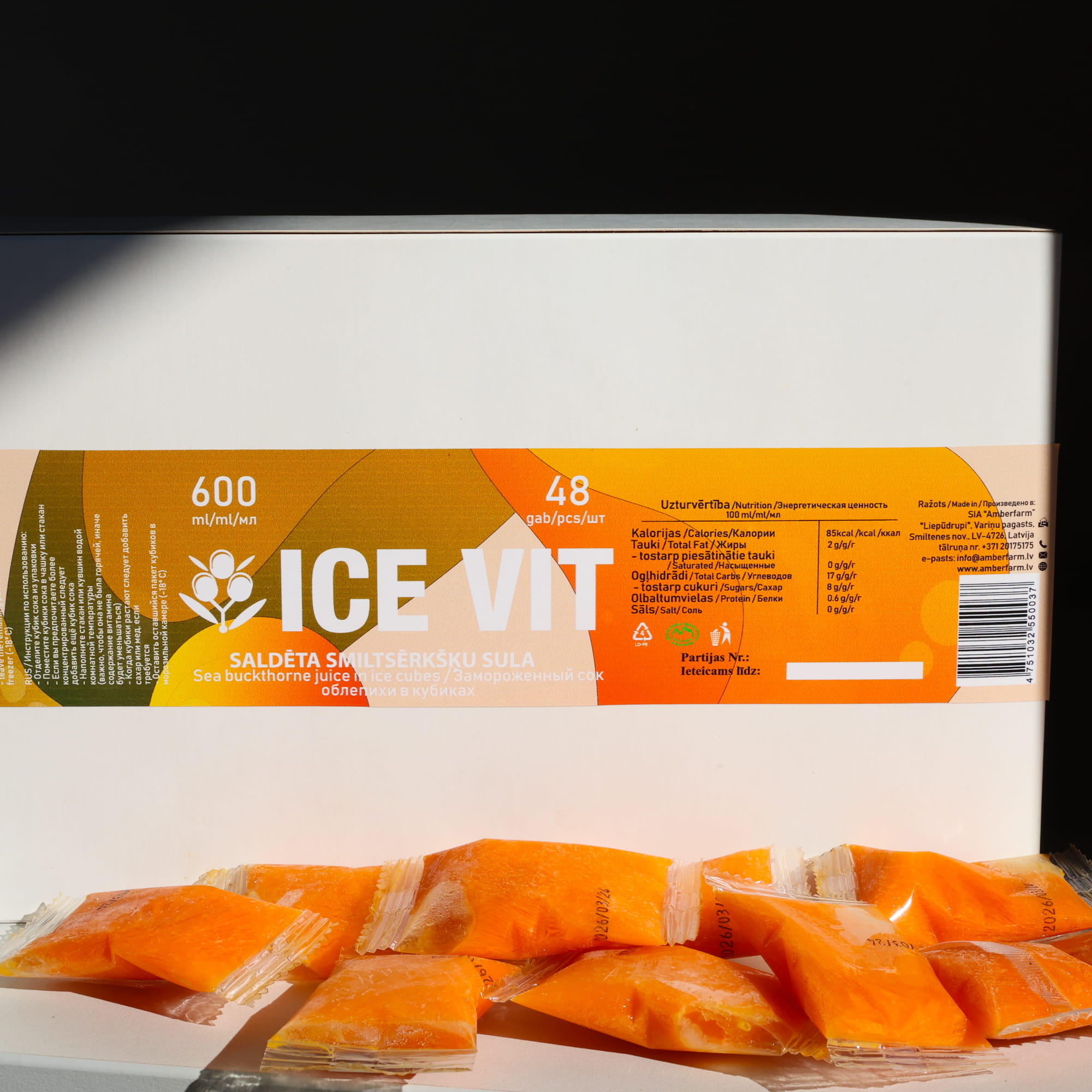 Latvijā audzētu smiltsērkšķu ogu saldēta sula 600 ml iepakojumā. 48 kubiņi ICE VIT.