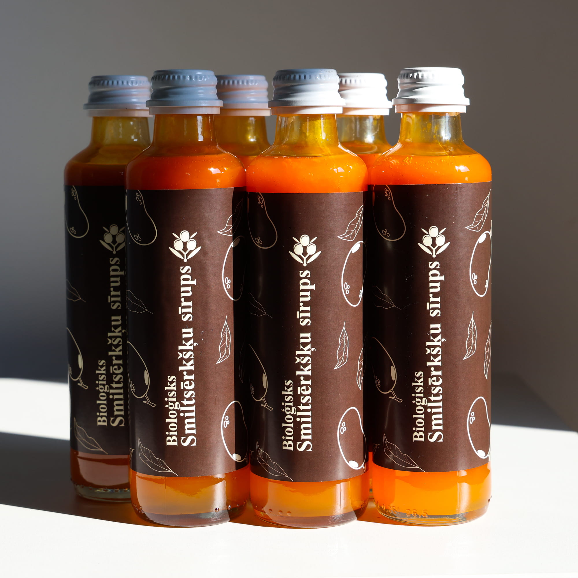 Bioloģisks smiltsērkšķu sīrups 250 ml pudelītēs no jaunākās Latvijas ogu ražas – 6 gab. (100 % koncentrāts). Taras depozīts 0.10 EUR iekļauts cenā.